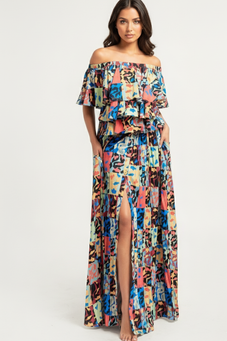 Elevate your wardrobe with our Printed Ruffle Top and Pleated Skirt Set, a vibrant ensemble that exudes style and versatility. This charming set is designed to offer you multiple styling options, ensuring you can effortlessly transition from day to night with ease.
