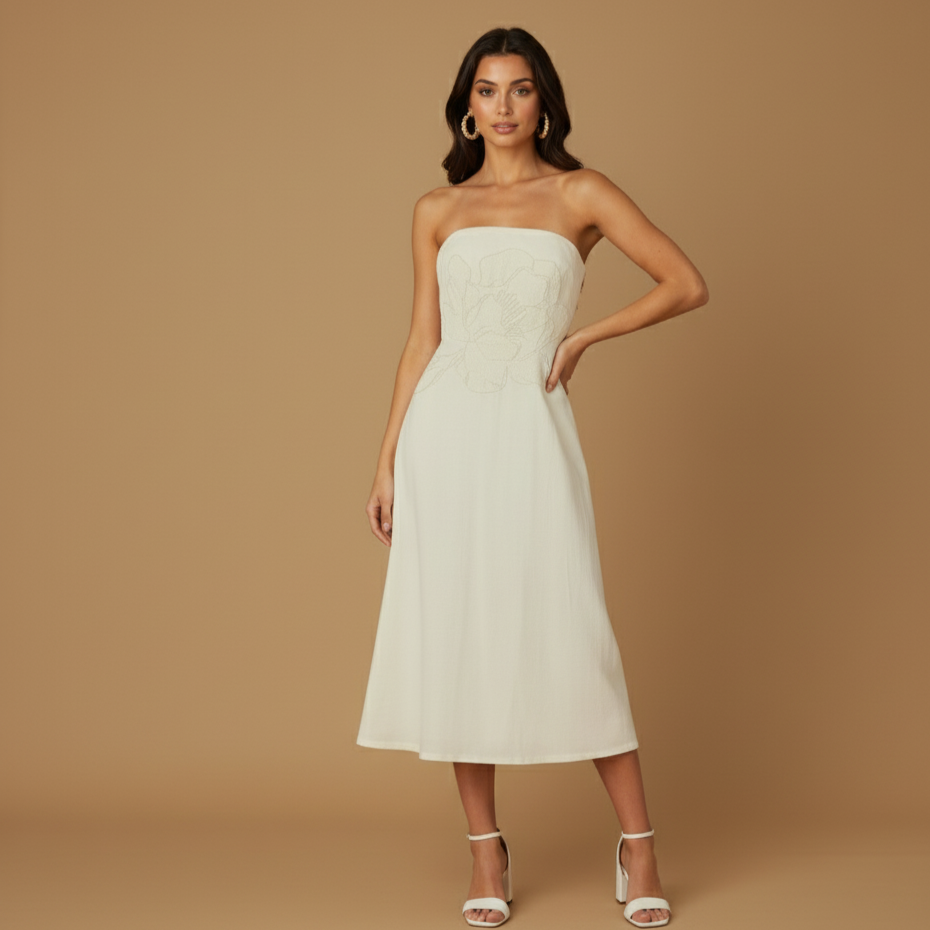 Breeze into elegance with this flower lining linen pattern strapless dress, designed to capture the essence of effortless charm. Featuring a beautifully textured linen-look fabric, the strapless silhouette is both feminine and refined. A subtle floral lining adds a hidden touch of detail, offering a romantic surprise with every movement. The fitted bodice and softly flared skirt create a flattering shape that’s perfect for warm-weather events or garden parties. Light, breathable, and easy to style, this dress is a seasonal favorite with timeless appeal.